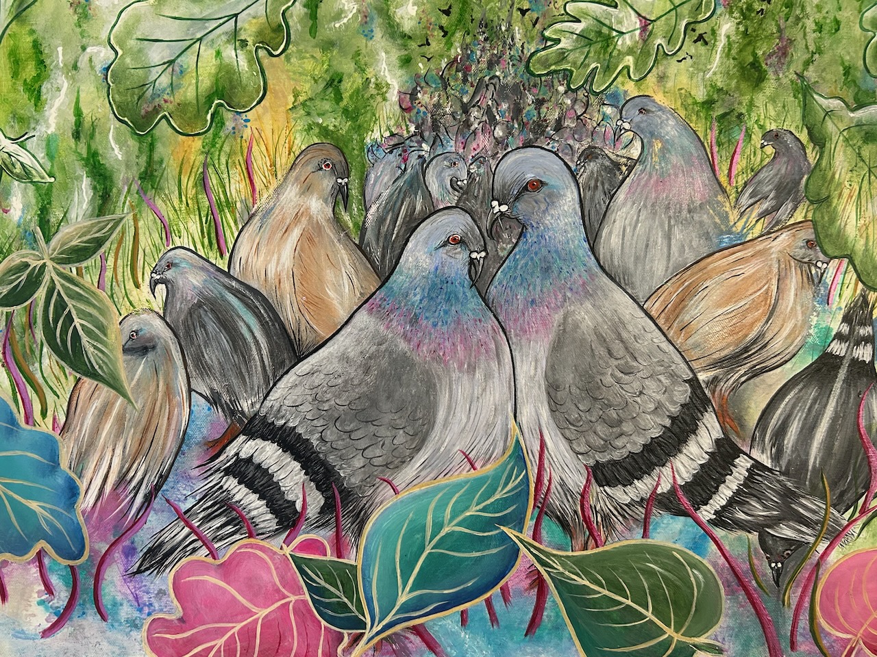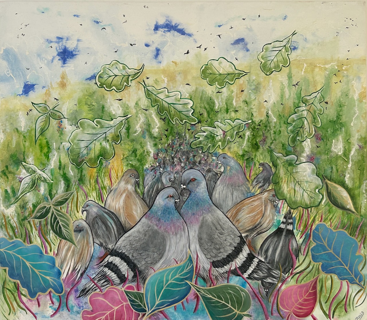 Homage to Pigeons – Approx 70 cm H x 80 cm W x 4 cm D.