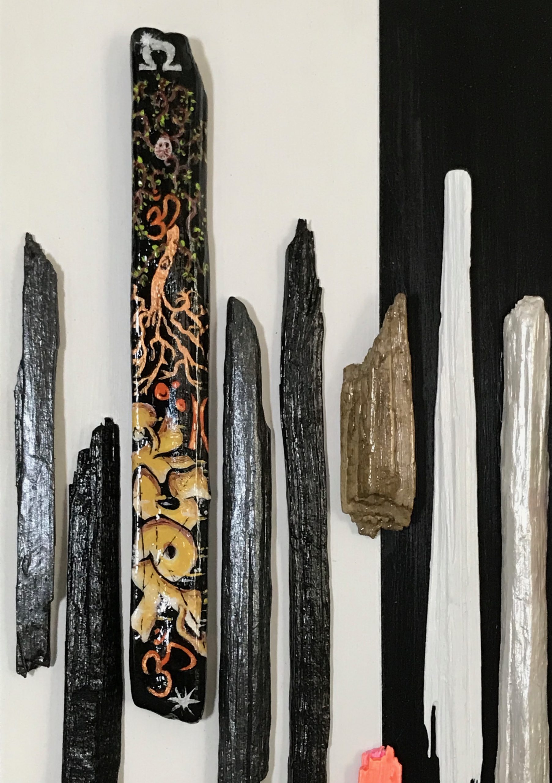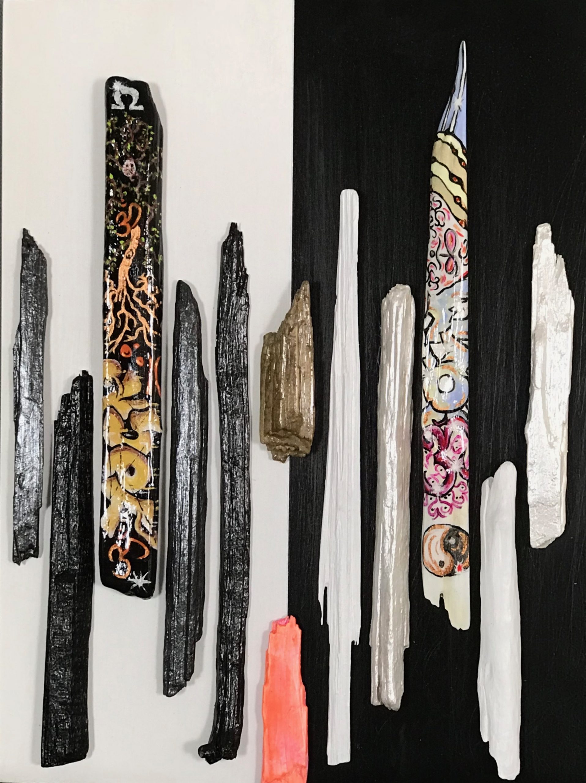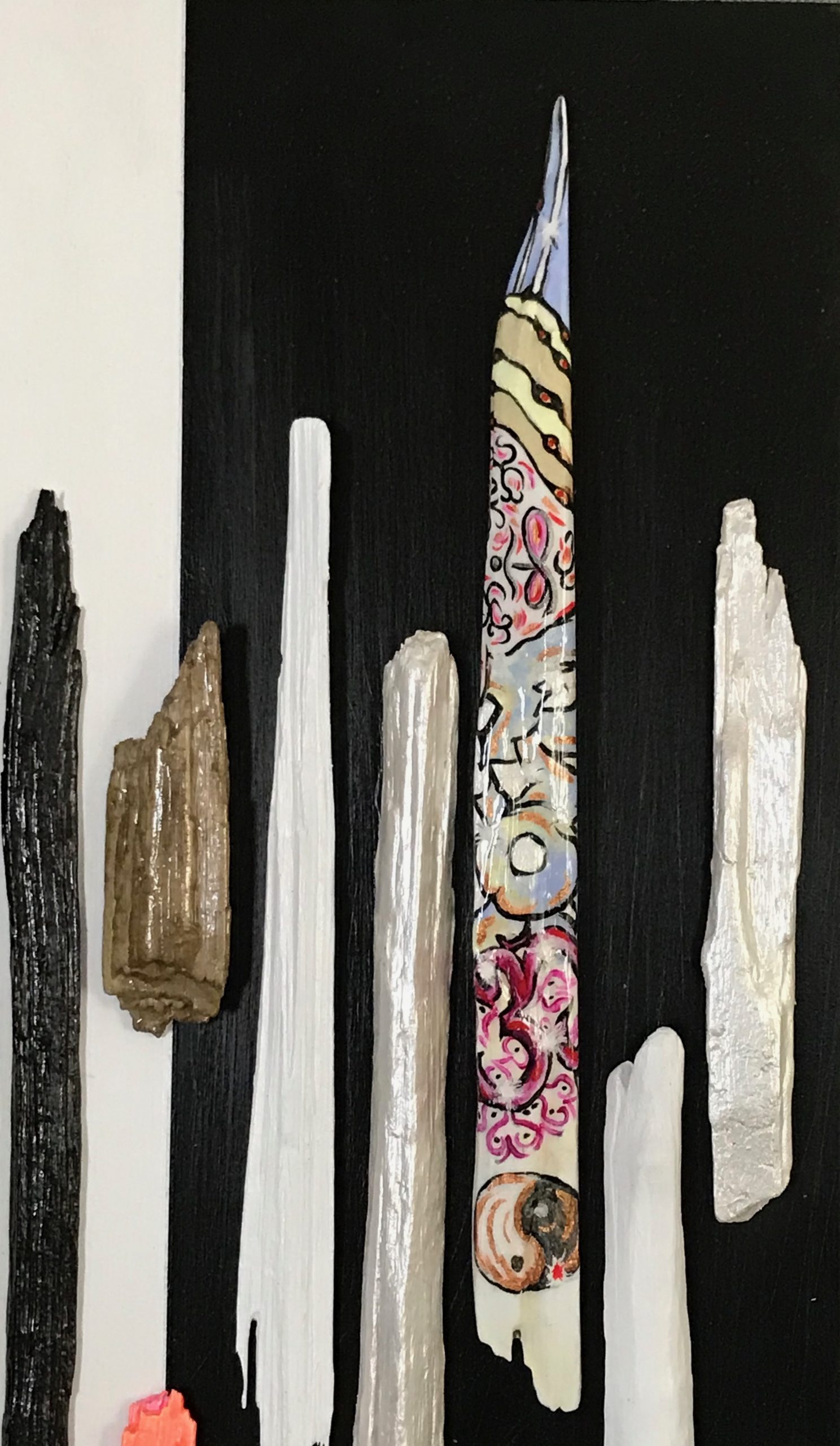 Yin and Yang 30 cm w x 40.5 h x1.5 cm d.  Acrylic/driftwood on board.